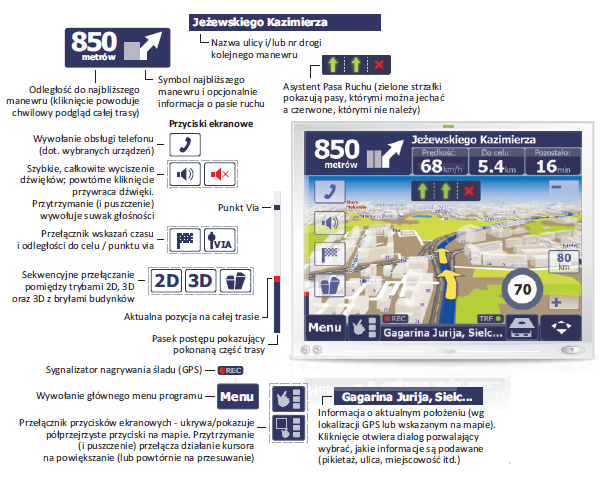 W trakcie podróży podaje komunikaty głosowe i wizualne informujące o kolejnych manewrach. Dzięki najdokładniejszym i najpełniejszym na rynku cyfrowym mapom Polski oraz intuicyjnemu i niezawodnemu oprogramowaniu AutoMapa potrafi prowadzić skutecznie do celu. Jako jedyna mapa na rynku zawiera dokładne położenia poszczególnych adresów a nawet kształty poszczególnych budynków.