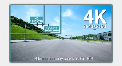 Rozdzielczość 4K UHD to czterokrornie większa liczba pikseli niż Full HD*. Jest to różnica, której nie sposób nie zauważyć. Obraz staje się dużo bardziej przejrzysty, a wszystke szczegóły jak np. tablice rejestracyjne, możliwe do odczytania z dużo wiekszej odległości. Również na monitorach Full HD możliwe jest znaczne powekszenie obrazu bez widocznej pikselizacji.