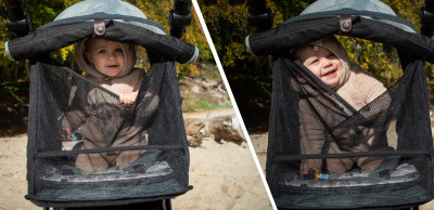 Możliwość poszerzenia budki zwiększa komfort malucha podczas spacerów niezależnie od aury i pory roku. Opcja przydatna o każdej porze roku zimą chroni przed opadami, latem przed słońcem.