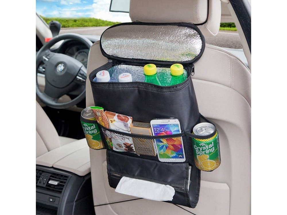 Organizer na fotel z torbą termiczną przeznaczony do zamontowania na tył przednich foteli samochodowych. Idealny do utrzymania porządku, doskonały do przechowywania różnych rzeczy w twoim samochodzie tj: mapy, napoje, jedzenie, długopisy, zabawki dziecka oraz różne drobiazgi.