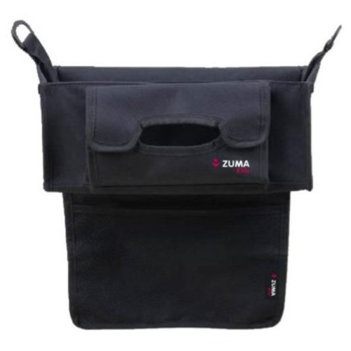 Uniwersalny organizer zapinany na rączki wózka za pomocą pasów z rzepem. Kieszeń z dwiema przegródkami na napoje. Dwie zewnętrzne kieszenie z siatką na drobiazgi oraz kieszonką na chusteczki.